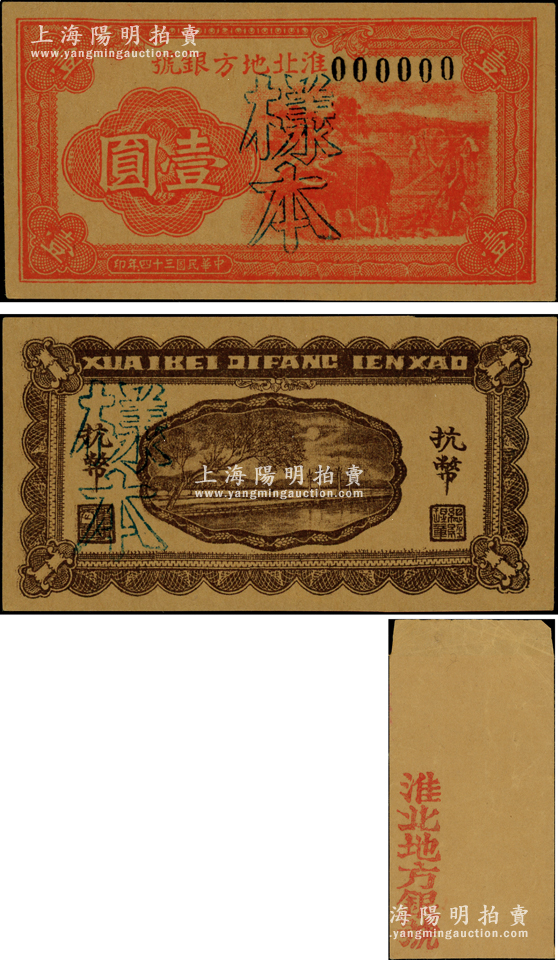 民国三十四年(1945年)淮北地方银号红色牛耕地图壹圆样本券,正背共2枚,属新四军抗币之珍罕品种,诚可遇而不可求也;源于新四军某司务长之遗存,且附昔日装此钞之信封1个,九五成新