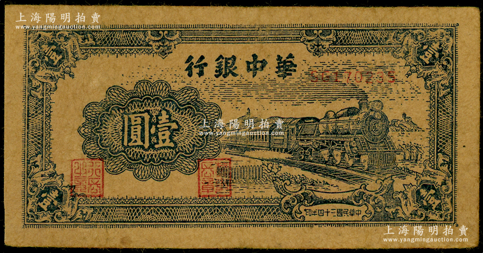 民国三十四年(1945年)华中银行蓝色火车图壹圆,原票七五成新