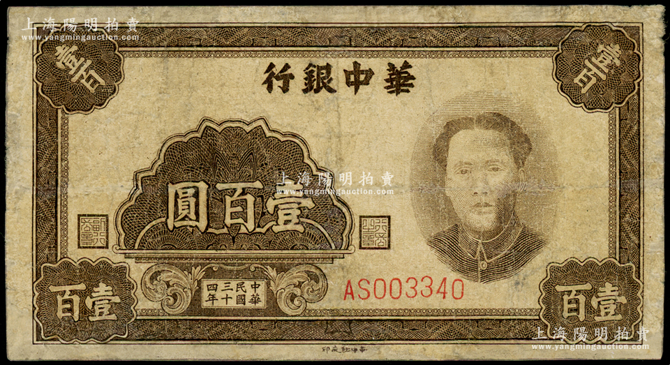 民国三十四年(1945年)华中银行褐色毛泽东像壹百圆,资深藏家出品,少见,七成新