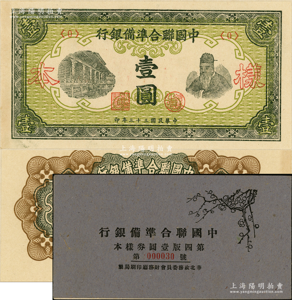 民国三十三年(1944年)中国联合准备银行孟子图壹圆样本券,正背共2枚,属《中国联合准备银行第四版壹圆券样本》之物;源于马定祥先生之旧藏,九八成新