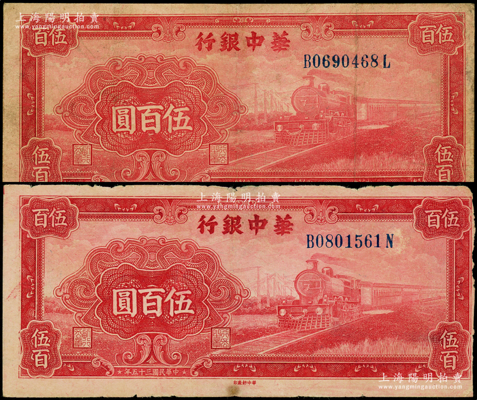 民国三十五年(1946年)华中银行红色火车图伍百圆共2枚,其背面均印花纹图,七成新