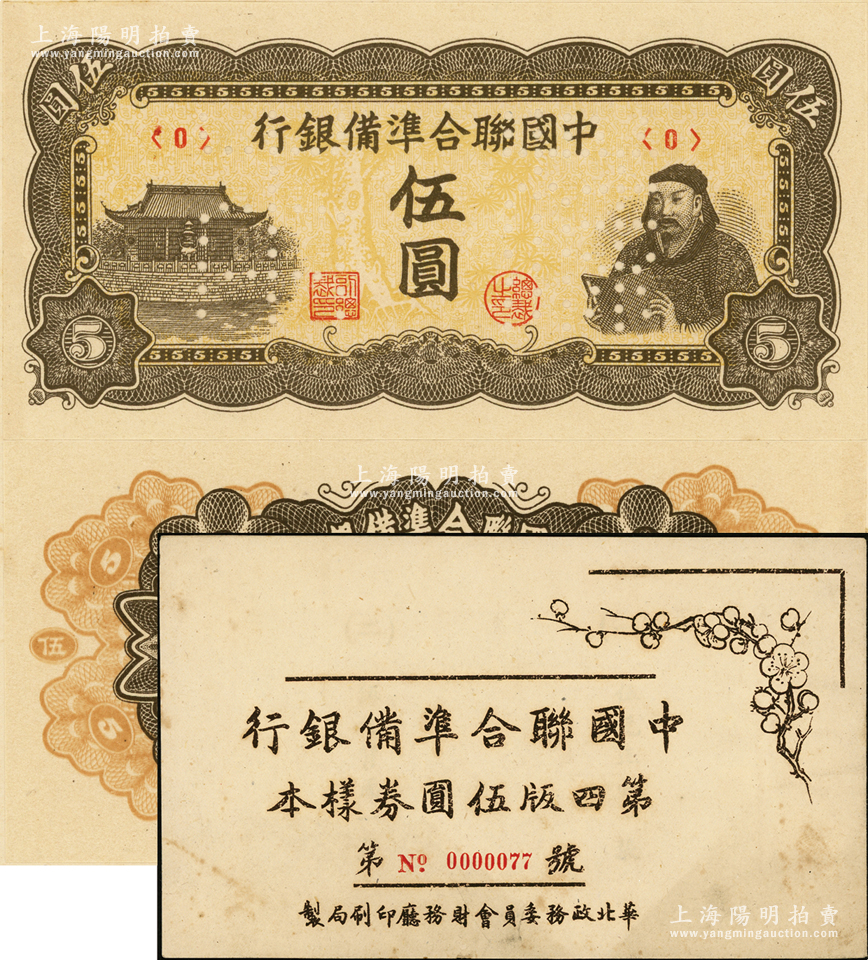 中国联合准备银行人读书图伍圆样本券,正背共2枚,属《中国联合准备银行第四版伍圆券样本》原册之物;源于马定祥先生之旧藏,九八成新