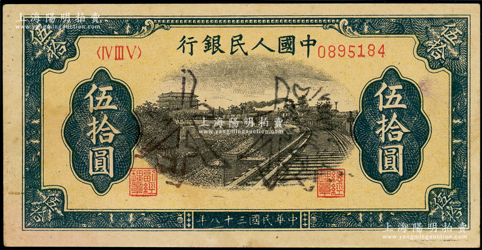 第一版人民币“铁路”伍拾圆正票改作样本,正面加盖空心字“样本”,属罕见版式(时在华中解放区使用),未折九至九五成新