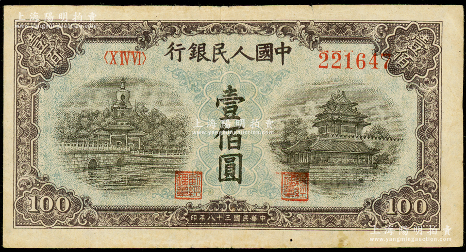 第一版人民币“蓝北海桥”壹佰圆,错版券·号码套印向右移位,且已错印在右上角花纹处,七五成新