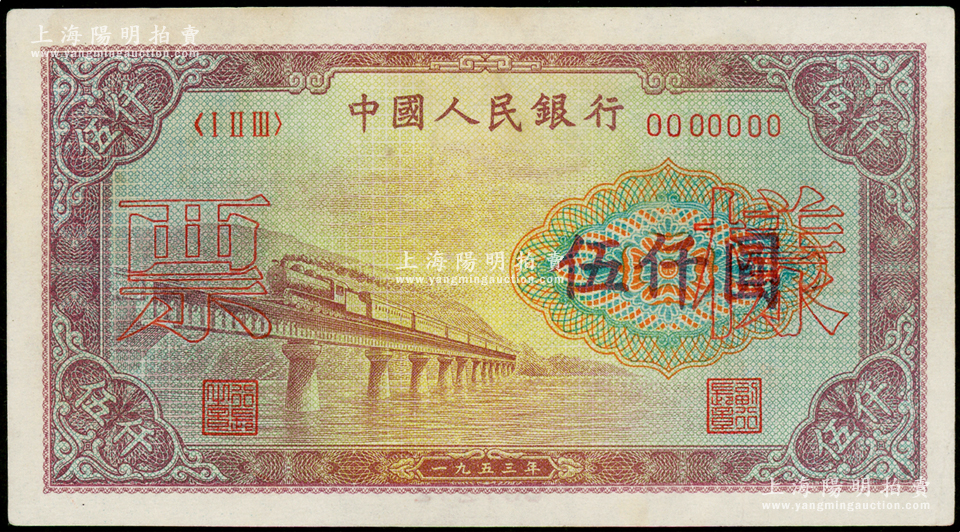 第一版人民币“渭河桥”伍仟圆票样,正背面合印,九五成新