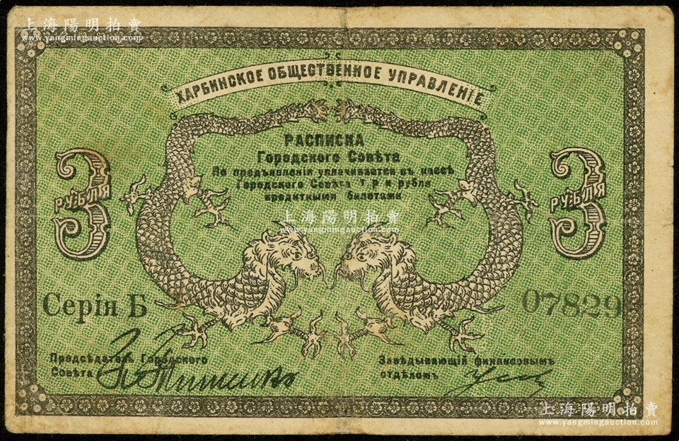 1919年哈尔滨市政管理局3卢布,与华俄道胜银行相关,属洋商客钞之体系;自清末以来,哈尔滨的市政管理一直由俄国人所控制,至1921年才由北洋政府收回司法权;源于前辈名家之遗藏,七五成新
