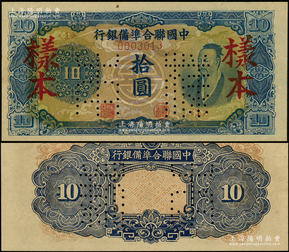 中国联合准备银行(1944年)蓝色尧帝像拾圆样本,正背面合印;源于马定祥先生之旧藏,九八成新