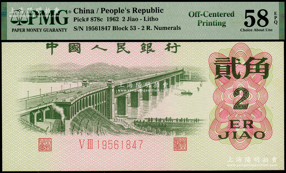 第三版人民币1962年贰角,错版券·正背印刷均向上移位,尤其正面行名“中”字已顶穿,罕见且极富趣味,九五成新