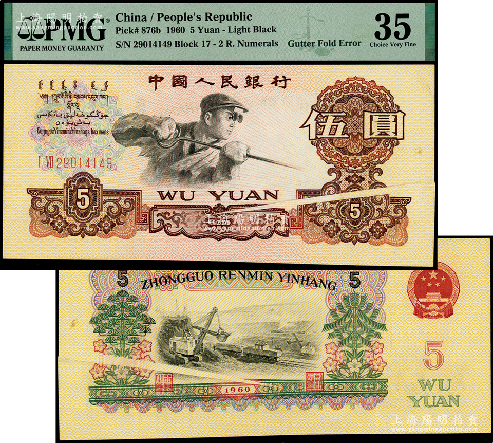 第三版人民币1960年伍圆,错版券·正背面均有明细之印刷折白,堪称错版收藏之别致精品(注:第三版错版券存世极为罕见),九成新