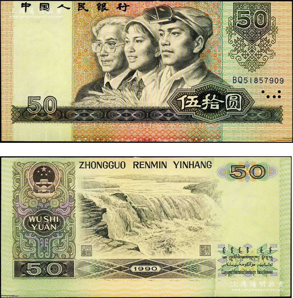 第四版人民币1990年伍拾圆,错版券·正背印刷均向上移位,导致下方大宽边且多出一段上边花纹,罕见且极富趣味,九五成新