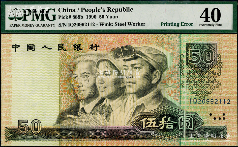 第四版人民币1990年伍拾圆,错版券·正面右边“圆”字处有折白,且三人像印刷向左移位,导致人像右边露白,PMG 40 EF