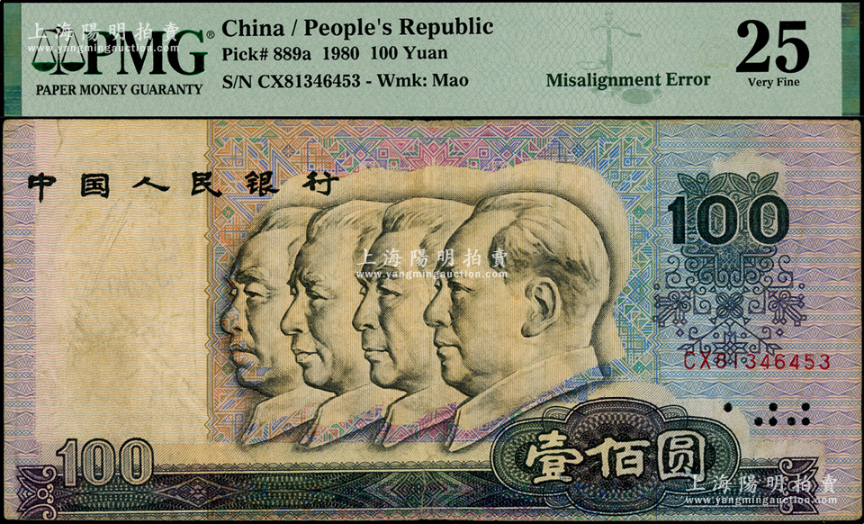 第四版人民币1980年壹佰圆,错版券·正面四伟人图套印严重移位,罕见且极富趣味,PMG 25 VF