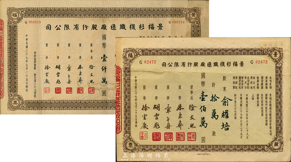 民国三十七年(1948年)景福衫袜制造厂股份有限公司股票共2枚不同,详分:拾万股计国币壹佰万圆;壹佰万股计国币壹仟万圆,票上股东均为俞耀培氏,八成新