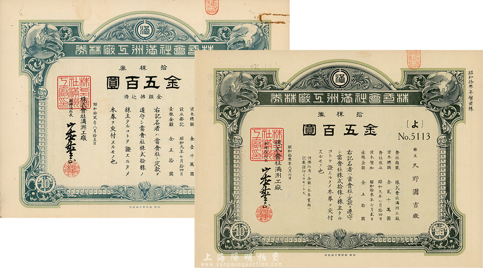株式会社满洲工厂株券共2种不同,详分:昭和拾贰年(1937年)拾株券金五百圆、昭和拾叁年(1938年)拾株券金五百圆,均有水印,八至九成新