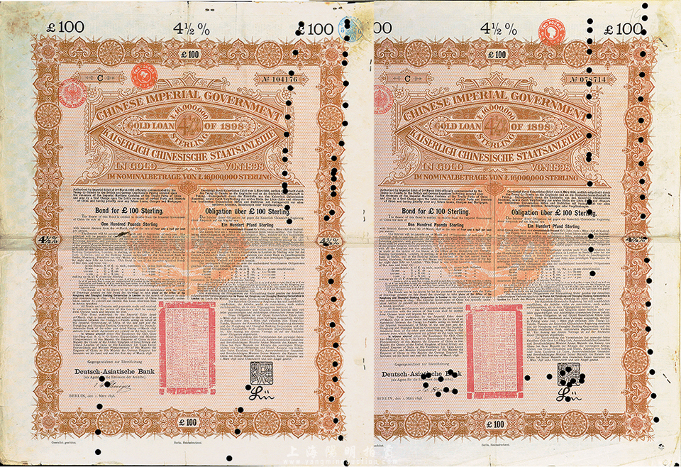 1898年大清中华帝国政府对外借款金债券100镑共2枚(不同签名),德华银行(Deutsch-Asiatische Bank)代理发行,七至八成新