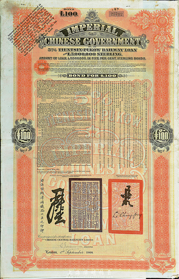 1908年(光绪三十四年)大清帝国政府对外发行津浦铁路债券桔色100英镑,由英商伦敦华中铁路公司(Chinese Central Railways Ltd., London)代理发行,海外藏家出品,八成新