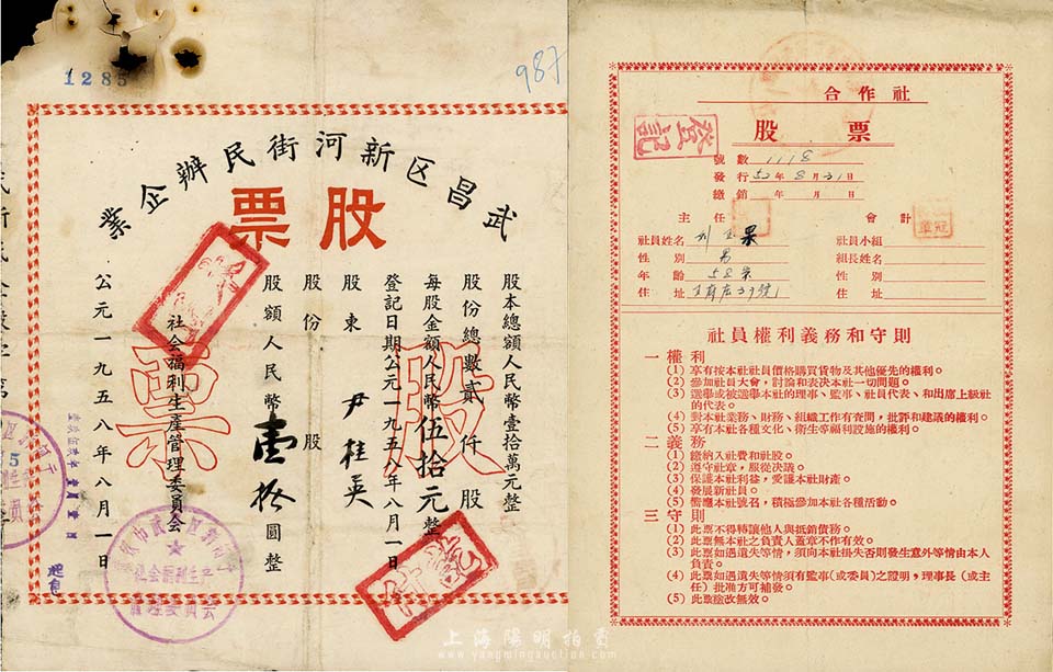 新中国老股票2种,详分:1952年某合作社股票,1股计15000元;1958年武昌区新河街民办企业股票,股额人民币壹拾圆;六至八成新