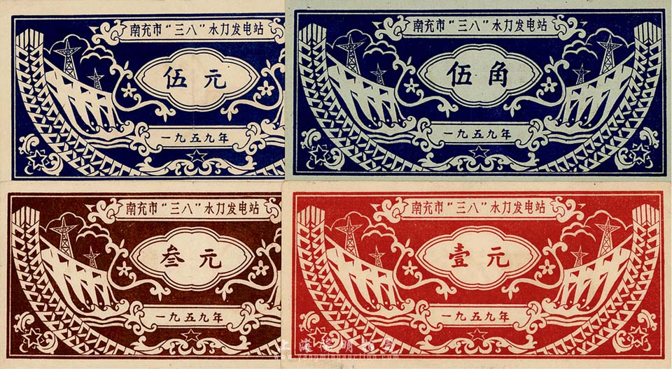 1959年(四川省)南充市“三八”水力发电站股票伍角、壹元、叁元、伍元共4枚大全套,新中国社会主义建设时期发行,八成新
