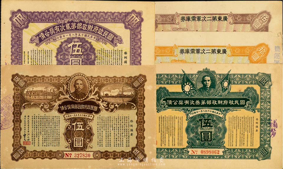民国债券5种,详分:国民政府财政部有奖公债1926年5月伍圆、第贰次有奖公债1926年8月伍圆、第叁次有奖公债1927年8月伍圆;1931年广东第二次军需库券伍圆、拾圆;七至八成新