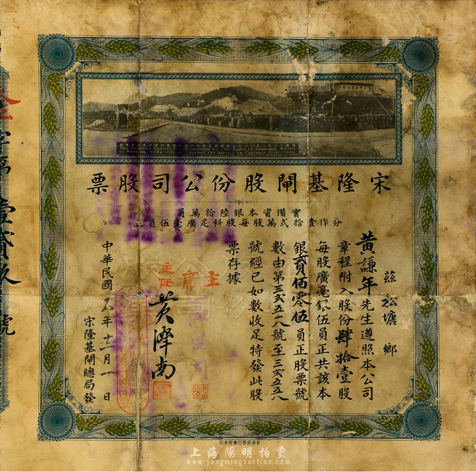 民国十八年(1929年)宋隆基闸股份公司股票,肆拾壹股共银贰佰零伍员,(注:宋隆基闸位于肇庆市高要金渡镇,由孙中山女婿戴恩赛任广东治河督办时所领导修建),上印该闸开幕典礼照片图,形制美观且少见,背有修补,七成新