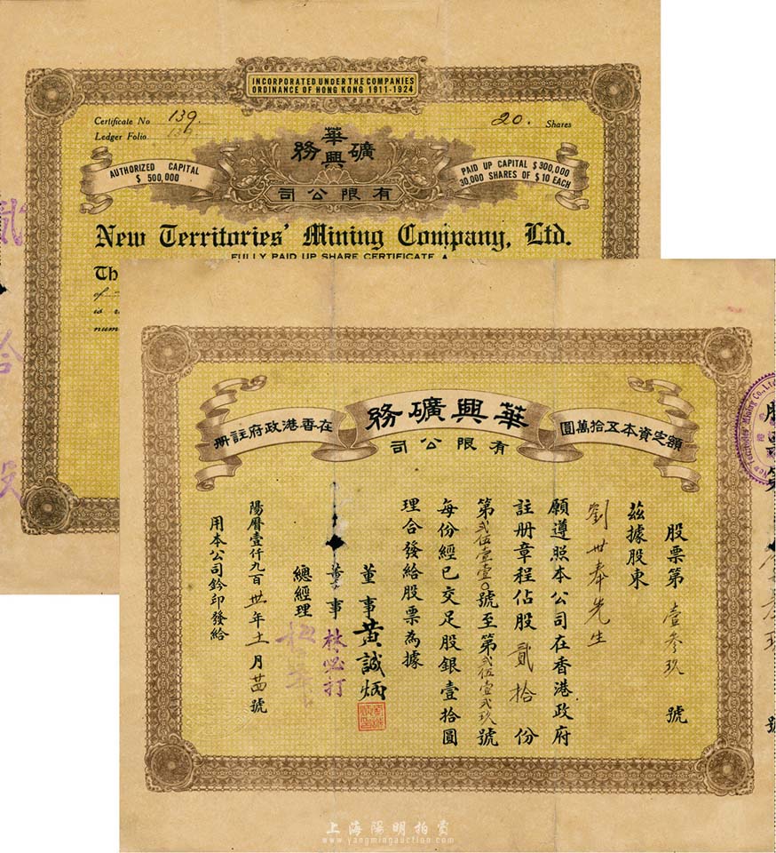 1931年(香港)华兴矿务有限公司股票,股贰拾份(每股壹拾圆),附带有封套;罕见品,中有小破损,七成新