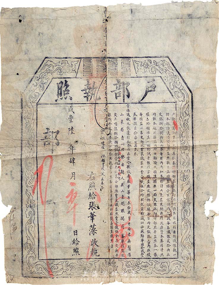 咸丰陆年(1856年)“户部执照”一份,由山东青州府乐安县人张华藻氏在山东捐赈总局捐银共89两6钱7分而捐得监生衔;此为清代买官制度之历史实证,保存尚可,敬请预览