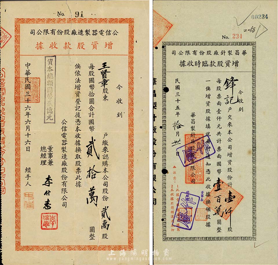 上海老股票2种,详分:1946年华昌制针厂股份有限公司增资股款临时收据,壹仟股计国币壹百万圆;1947年公信电器制造厂股份有限公司增资股款收据,贰万股计国币贰拾万圆;七至八成新