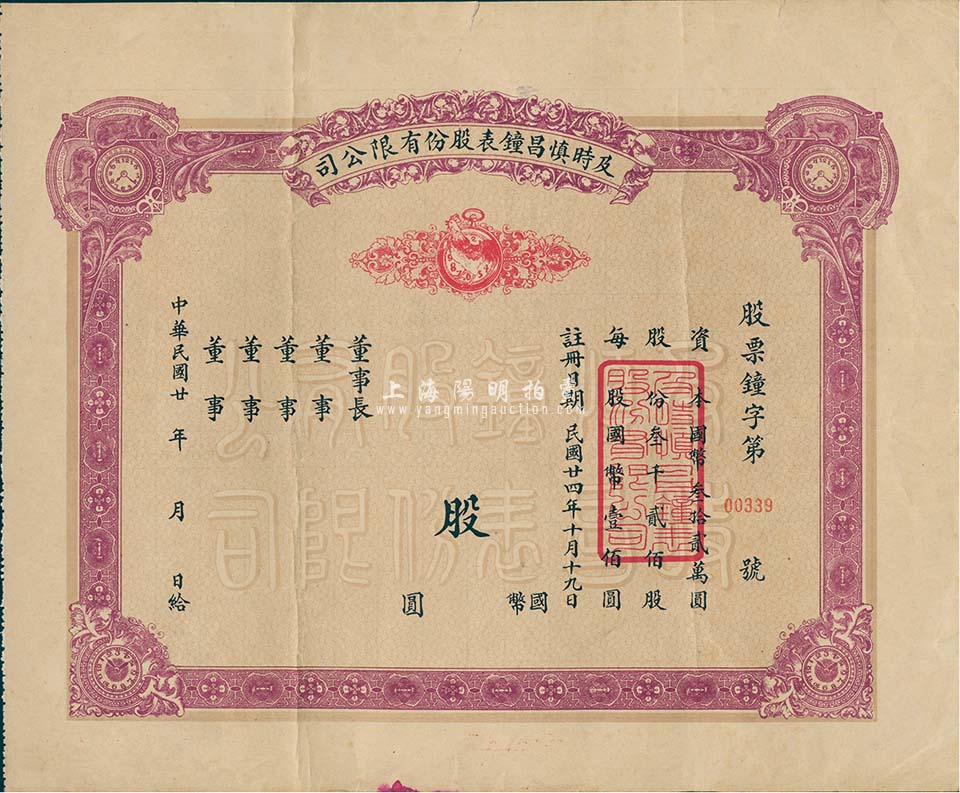 民国廿年(1935-)及时慎昌钟表股份有限公司股票,未填用发行,票上印有公鸡和钟表图,八成新