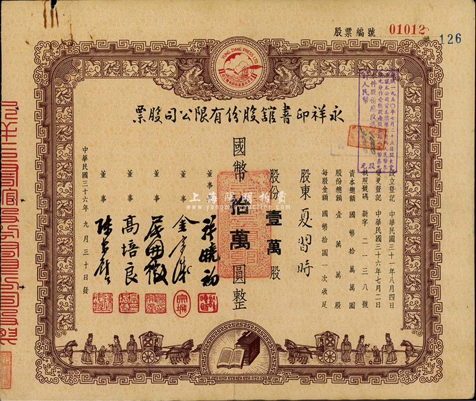 民国三十六年(1947年)永祥印书馆股份有限公司股票,壹万股计国币拾万圆,票上印有“文化之光”和孔子周游列国图等,设计极富传统内涵,八成新