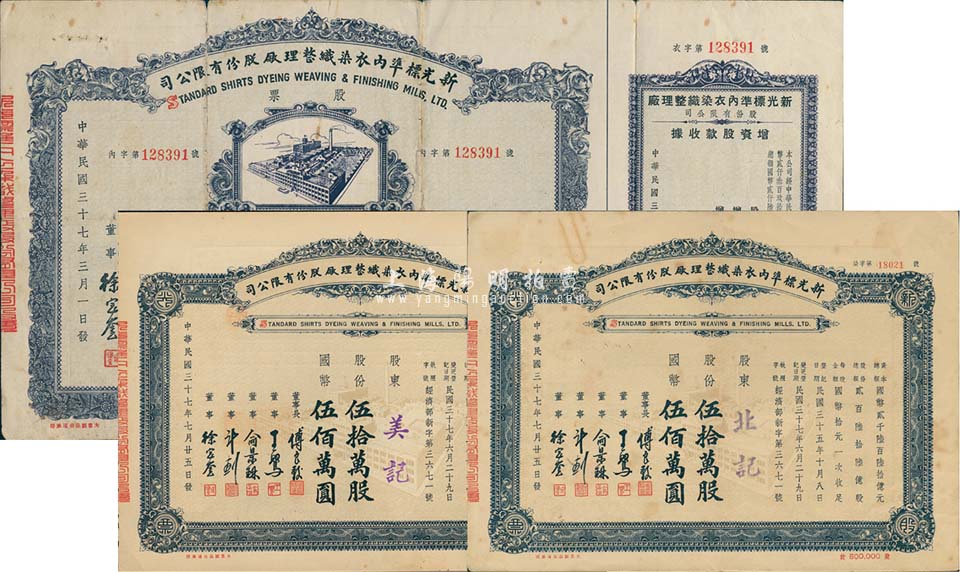 民国三十七年(1948年)新光标准内衣染织整理厂股份有限公司股票共3枚,详分:伍万股计国币伍拾万圆,附带增资股款收据;伍拾万股计国币伍佰万圆2枚;票上董事长即上海滩“衬衫大王”傅良骏氏;七至九成新