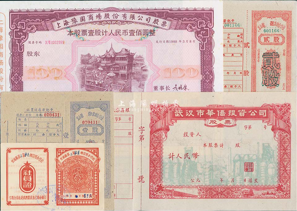 新中国股票5种,详分:1954年忻城县第三区龙贡乡信用合作社股票,未填用;19xx年宜山县公社供销合作社股票2枚,面额分别为壹股、贰股,均附社员股票登记卡;武汉市华侨投资公司股票,未填用;1988年上海豫园商场股份有限公司股票,壹股计人民币壹佰圆样票;九成新