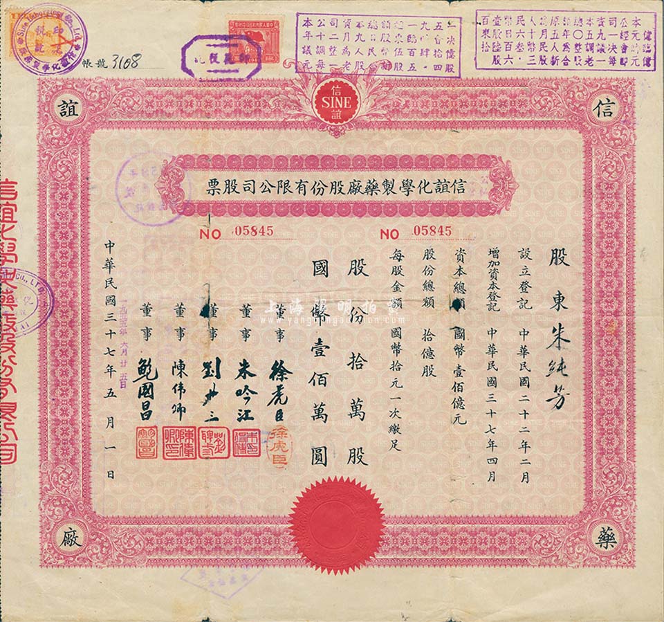 民国37年改1955年公私合营信谊化学制药厂股份有限公司股票,拾万股计国币壹佰万圆,票上盖有解放后资本调整之戳记,七成新