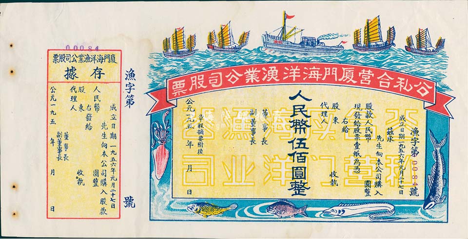 1956年公私合营厦门海洋渔业公司股票,人民币伍佰圆,未填用附存据,图案美观;九成新