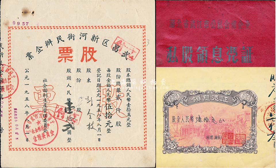 50年代湖北老股票2种,详分:1956年湖北省武汉市公私合营(霞光楼中心店)私股领息凭证,股金人民币陆拾元,小册型,所印游行图极富社会主义特色;1958年武昌区新河街民办企业股票,股额人民币壹拾贰圆;八成新