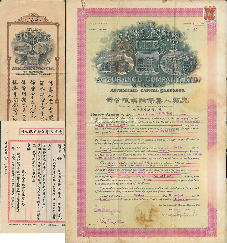 民国十五年(1926年)先施人寿保险有限公司保寿单,保款广东双毫银壹千元,中英文双面印刷;该公司乃先施公司之旗下企业,附带有公函和封套,少见,近八成新