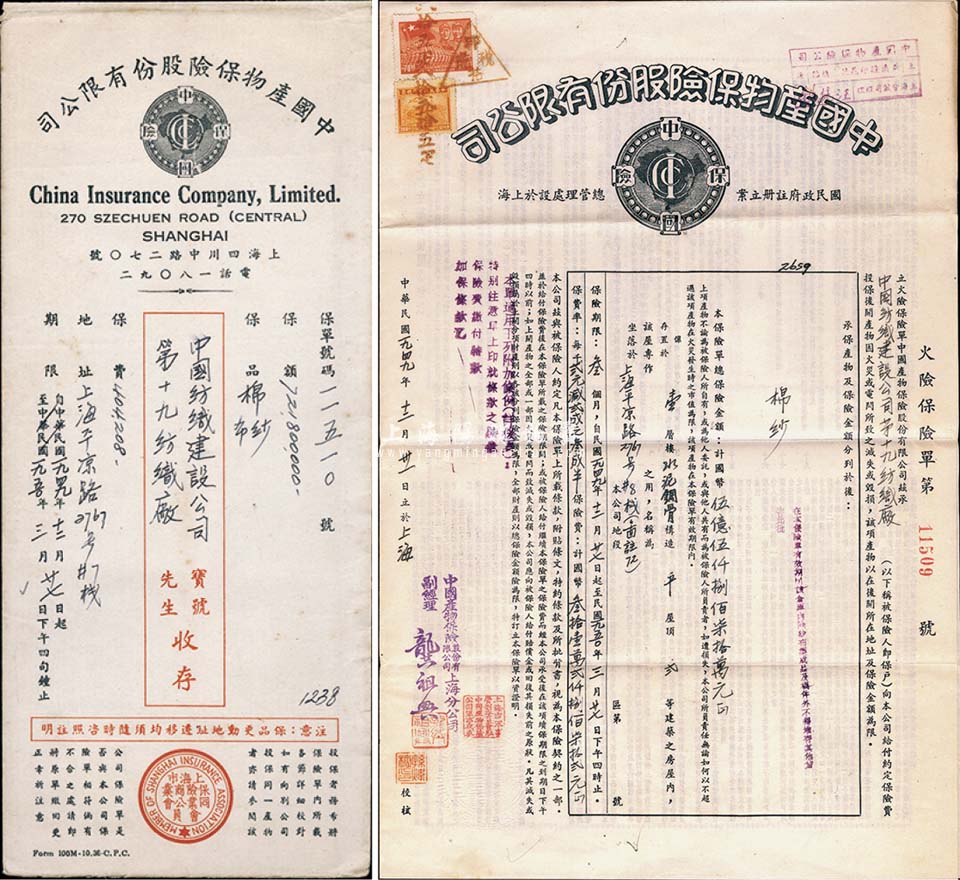 1949年中国产物保险股份有限公司火险保险单,由中国纺织建设公司第十九纺织厂投保,金额高达国币5.587亿元,附带原封套,八成新