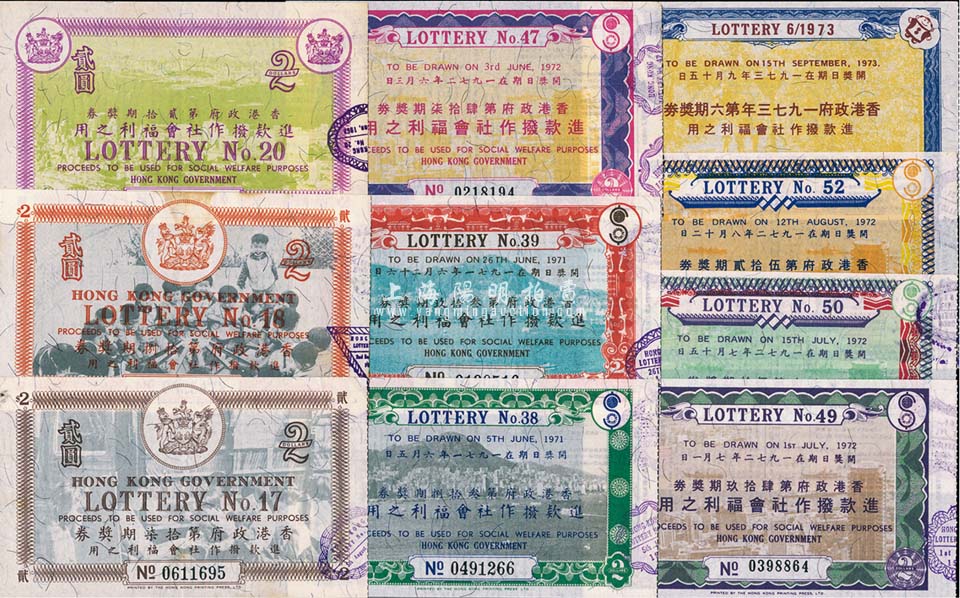 1967至1973年香港政府奖券共10枚不同,期别、图案各不相同,九成新