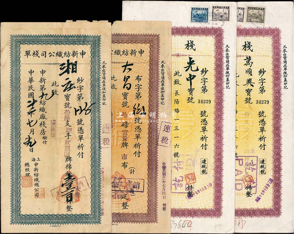 1933至1948年(上海)申新纺织公司栈单共4枚,内含3种版式,适合于股票实物资料;该公司乃1915年荣宗敬、荣德生兄弟所创办,也是中国近代棉纺织工业中规模最大的民族资本企业;七至八成新