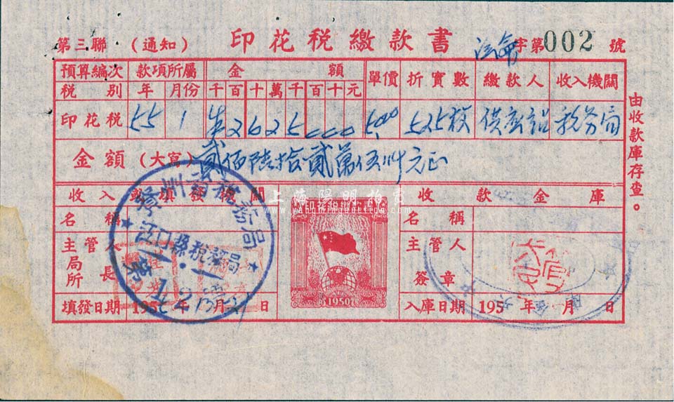 1955年印花税缴款书1张,其上印有税票图,八成新