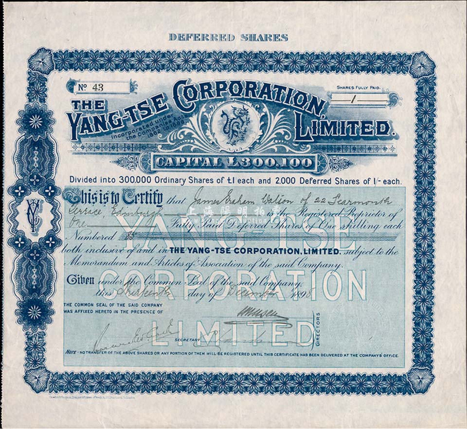 1898年英商Yang-Tse(扬子)有限公司股票,面额1股(每股1镑),上印龙图;该公司成立于1862年,可能是最早期的对华外商企业;八成新