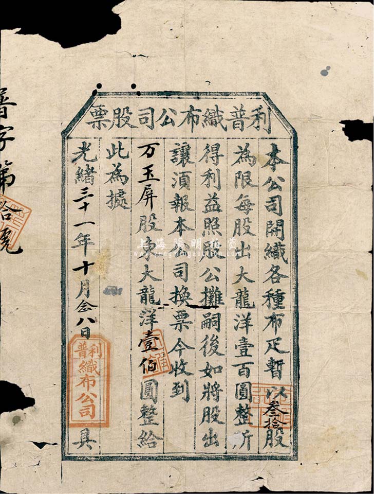 光绪三十一年(1905年)利普织布公司股票龙洋壹伯圆,该股票仅发行30股为限,故存世极为少见;有破损,六成新