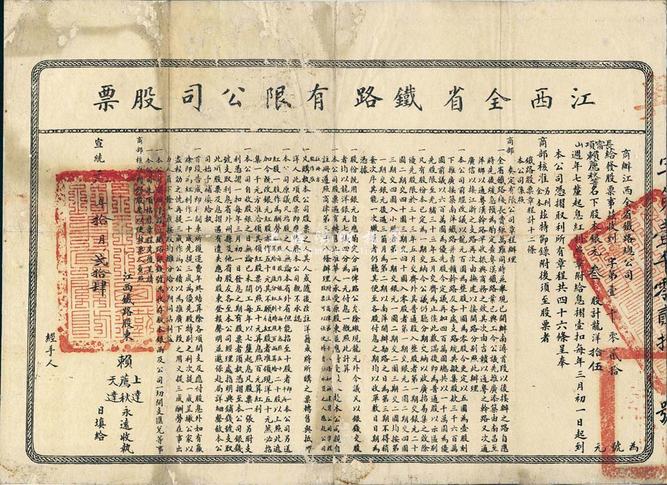 宣统元年(1909年)江西全省铁路有限公司股票,叁股计龙洋拾伍元,票上印有详细章程;罕见品,有破损及背有贴补,七成新