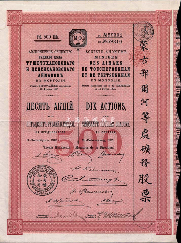 1912年蒙古鄂尔河等处矿务股票,10股计500卢布,印刷精致且满版水印,少见,八五成新