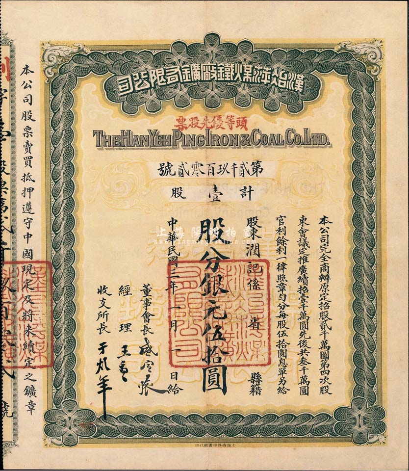 民国三年(1914年)汉冶萍煤铁厂矿有限公司头等优先股票,壹股计银元伍拾圆,票上有晚清重臣盛宣怀氏签名,附带有息单和封套,八五成新