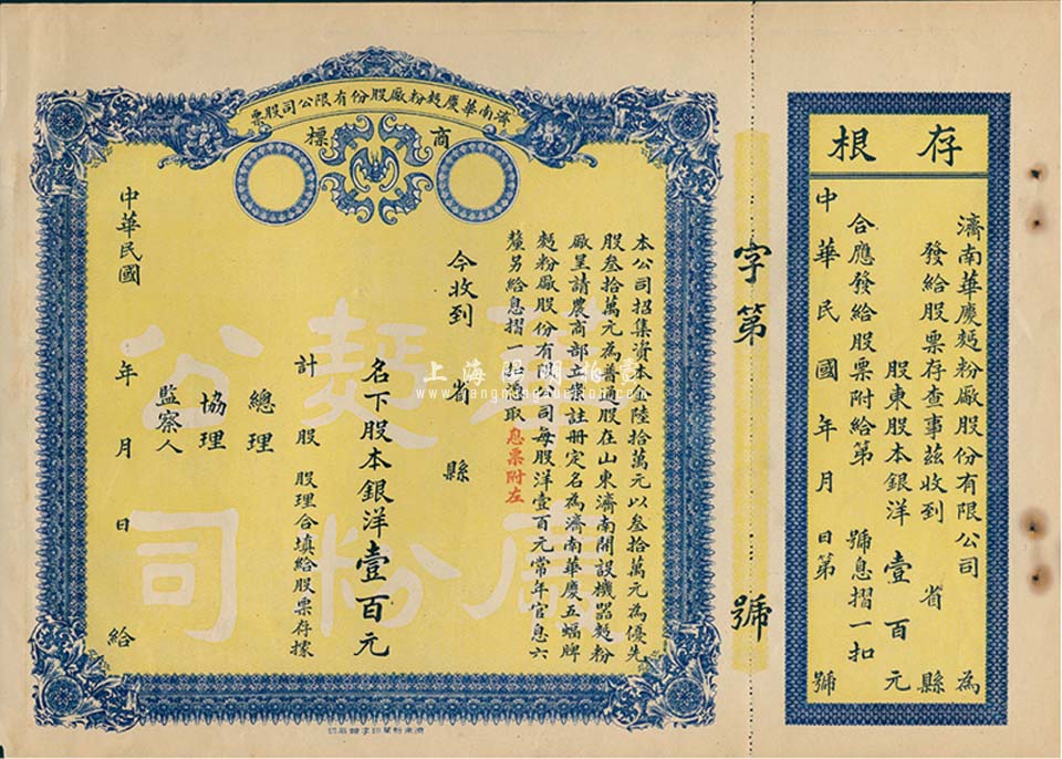 民国年·济南华庆面粉厂股份有限公司股票,股本银洋壹百元,未填用带存根,八成新