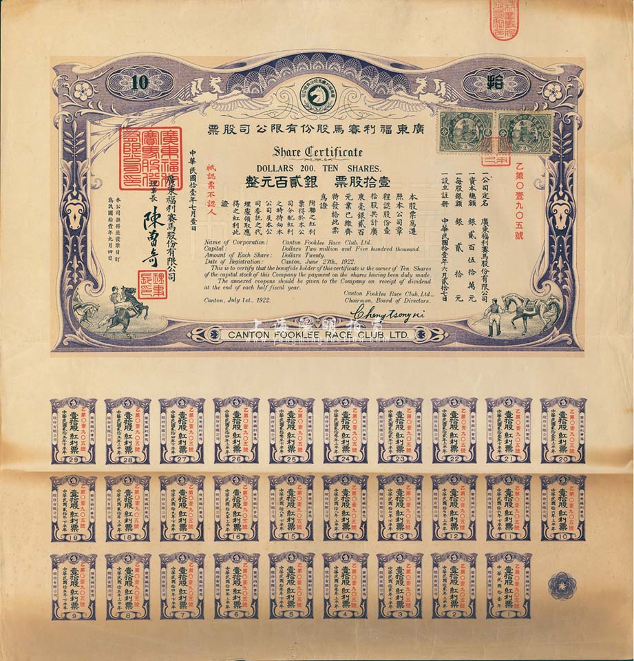 民国拾壹年(1922年)广东福利赛马股份有限公司股票,壹拾股计银贰百元,有水印,且附带完整息票;八成新