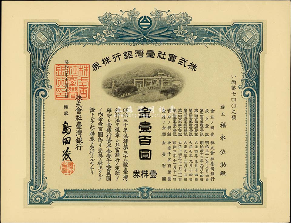 昭和二年(1927年)株式会社台湾银行株券,壹株券金壹百圆,蓝色,有水印,香港集趣堂藏品,九五成新
