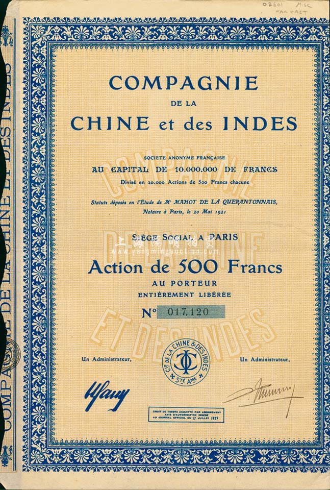 1929年法属中国印度公司股票500法郎,蓝色花纹,附带完整息票,法国藏家出品,九成新