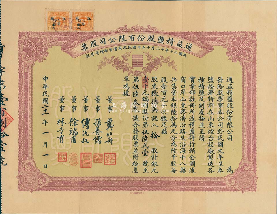 民国二十一年(1932年)通益精盐股份有限公司股票,拾股计银元壹千元;该公司于1920年呈奉盐务署特许在烟台设厂制造精盐,并呈准实业部行销全国,票上董事龚仙舟曾任北洋政府总理、傅沅叔即为曾任教育总长的傅增湘氏、徐端甫乃大总统徐世昌之弟;罕见品,附带有封套,八五成新
