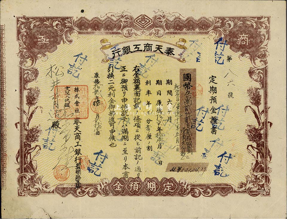 康德拾贰年(1945年)奉天商工银行·定期预金证书,面额国币五万贰仟贰百贰拾四圆壹角九分,七五成新